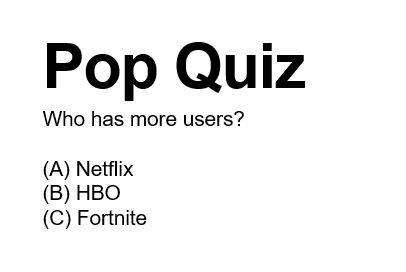 My son, who is not a regular Fortnite player but has played with his older brother before, guessed Netflix. Although he already knew about the impressive stats John shared about Fortnite, he thought Netflix would have a larger audience because it has been around longer.