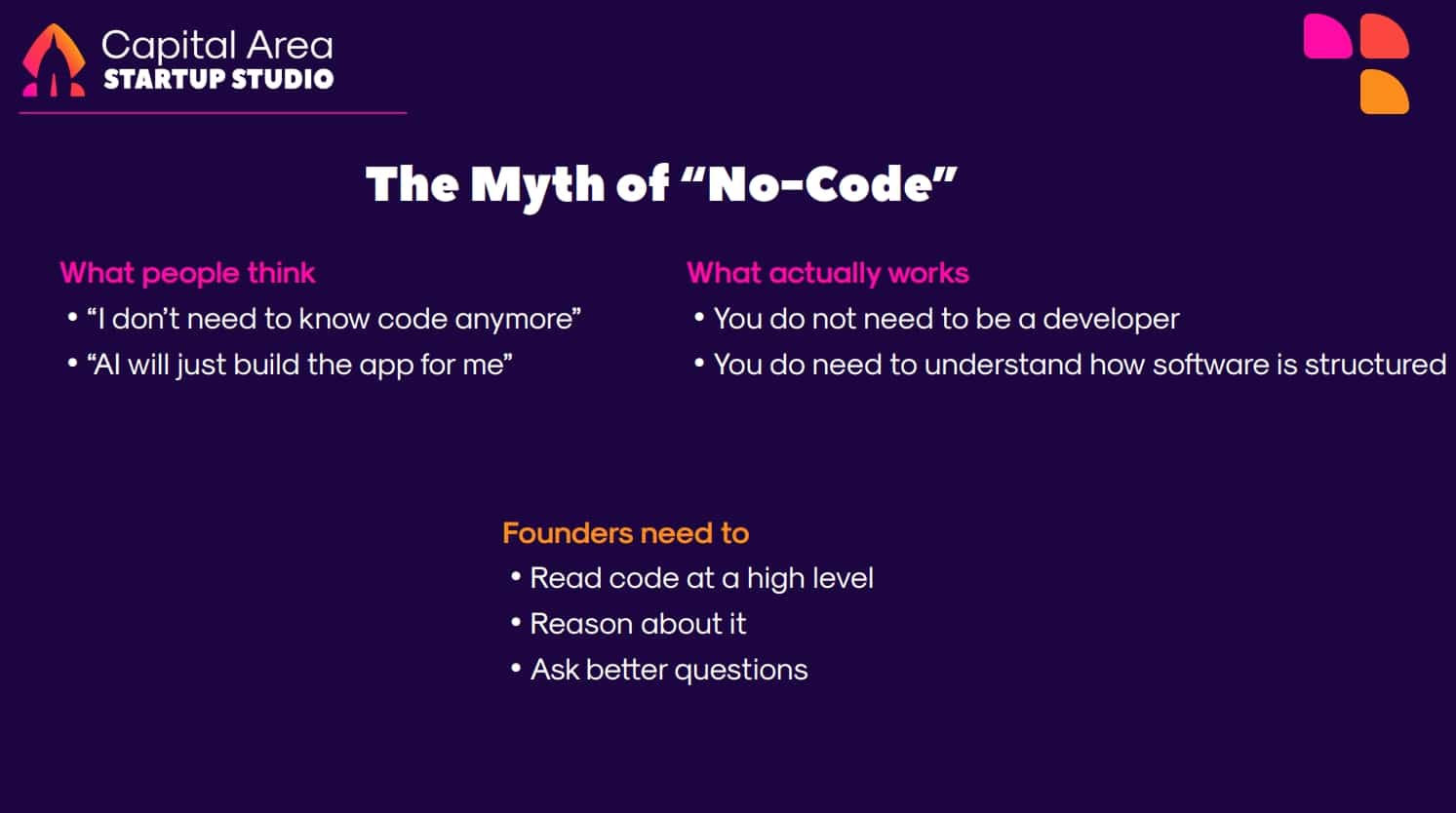 Low-code and no-code tools are often marketed as eliminating the need to understand software entirely, but in practice no-code is a little bit of a myth. Founders do not need to be developers to use AI tools to build software, but they do need basic code literacy to read, reason about, and ask better questions of their tools.
